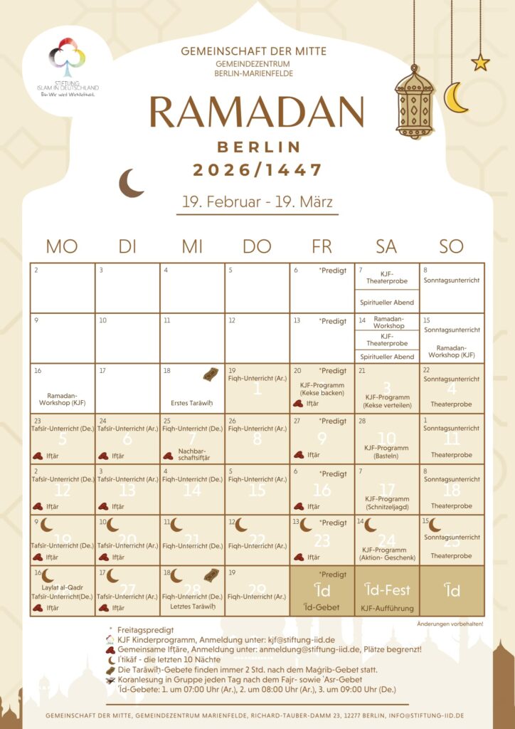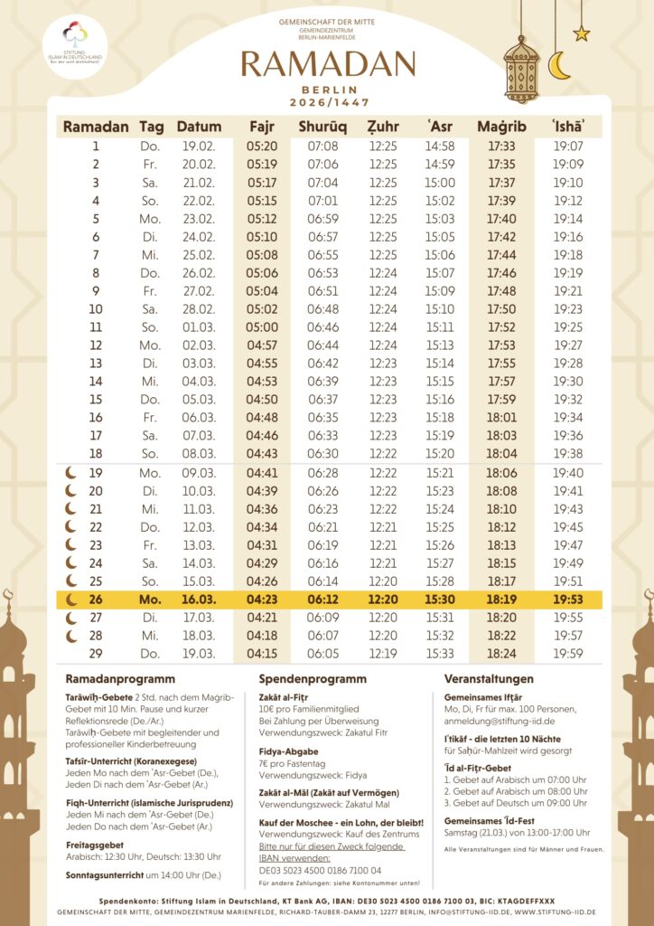 Wie bereits im letzten Jahr starten wir wieder jeden Abend nach dem Isha’a Gebet das Taraweeh Gebet. Es beginnt immer zwei Stunden nach dem Maghrib in Berlin. Den Gebetszeitenkalender für Berlin findet ihr oben auf dieser Seite. Ihr könnt vor Ort dabei sein oder auch wieder online.